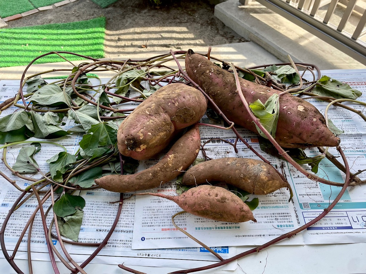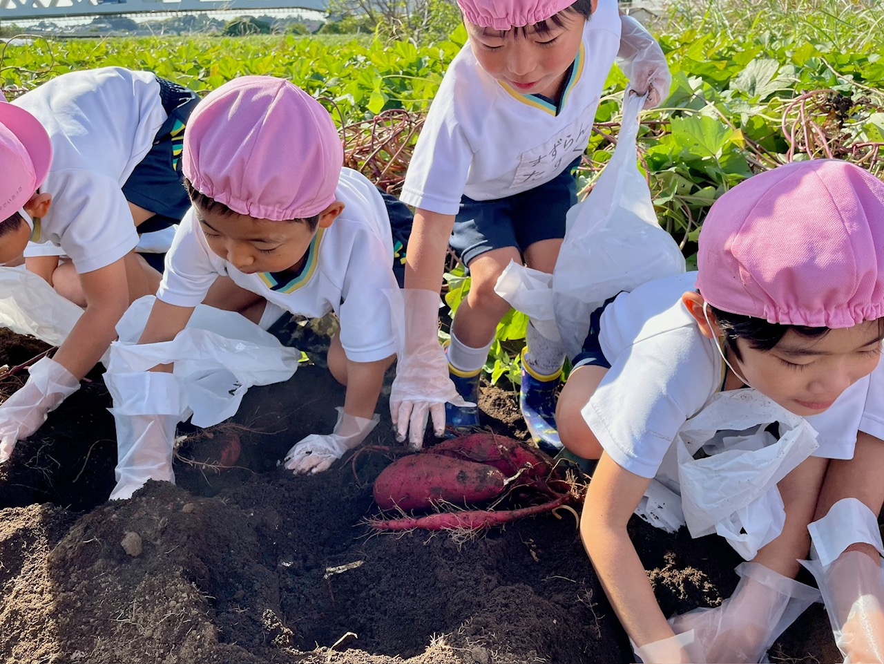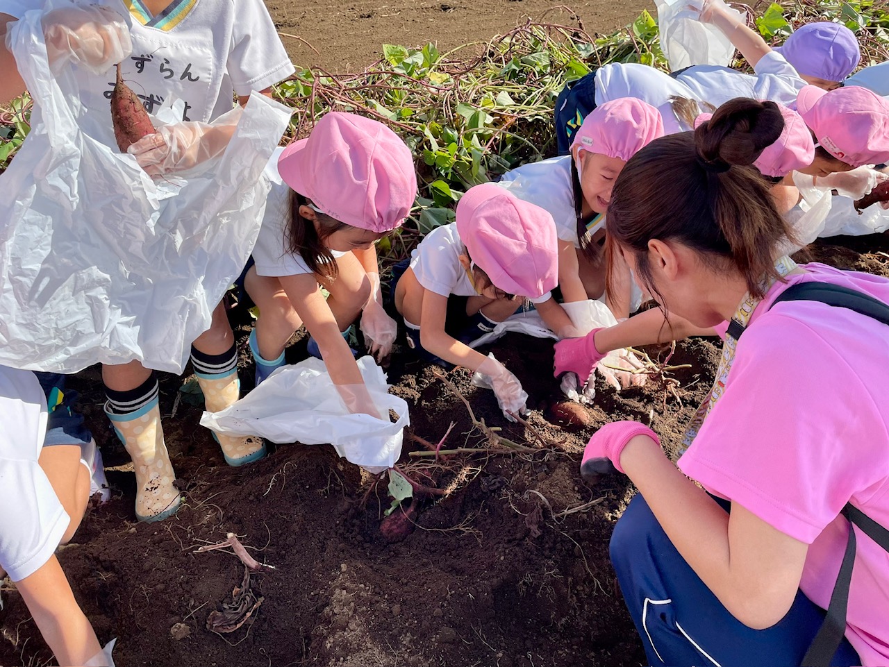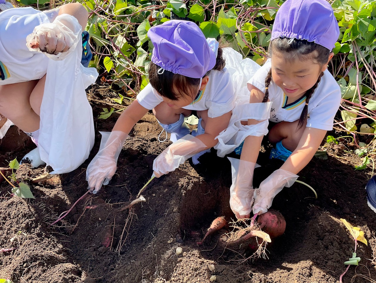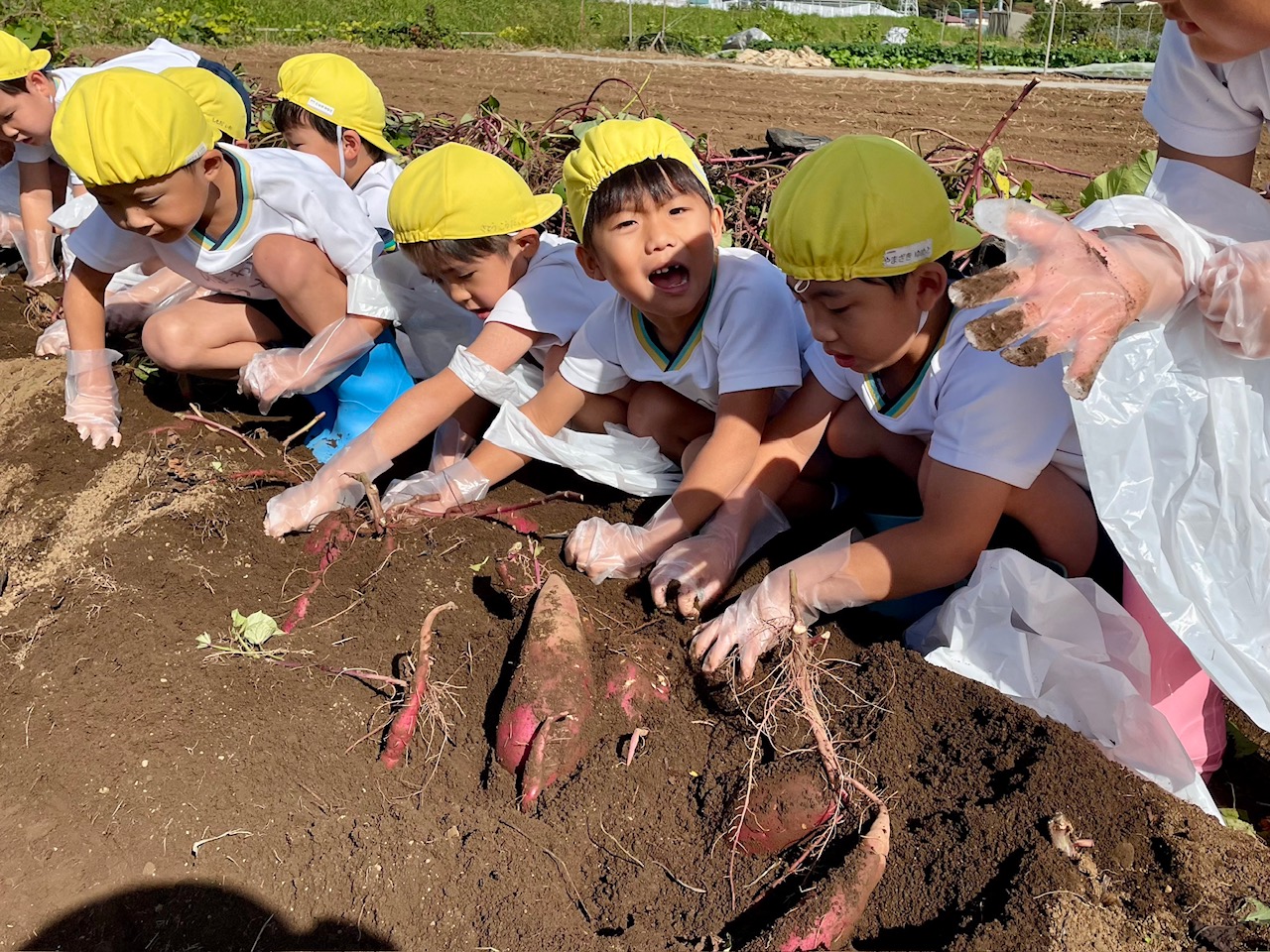 畑に着いて掘りはじめると、大きなお芋がゴロゴロ!!顔より大きなお芋に子ども達も大喜び!「重いよ~」といいながらお芋がたくさんつまった袋を運んでいました。