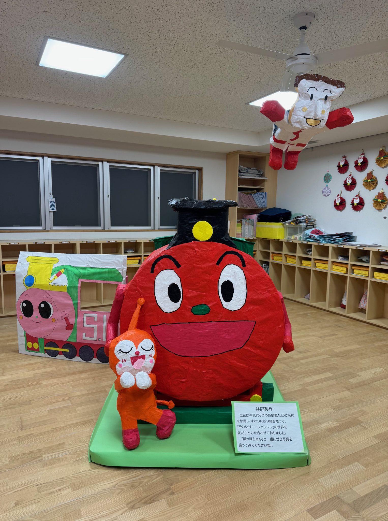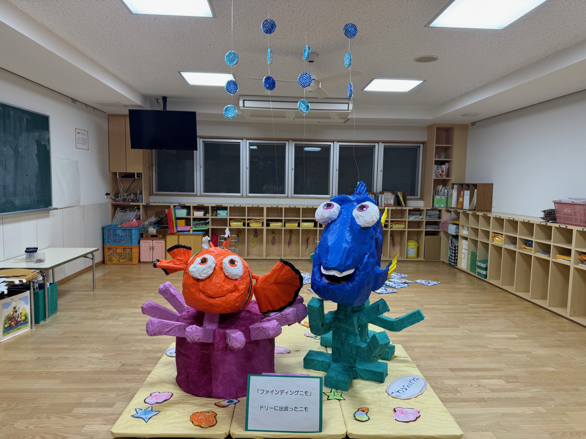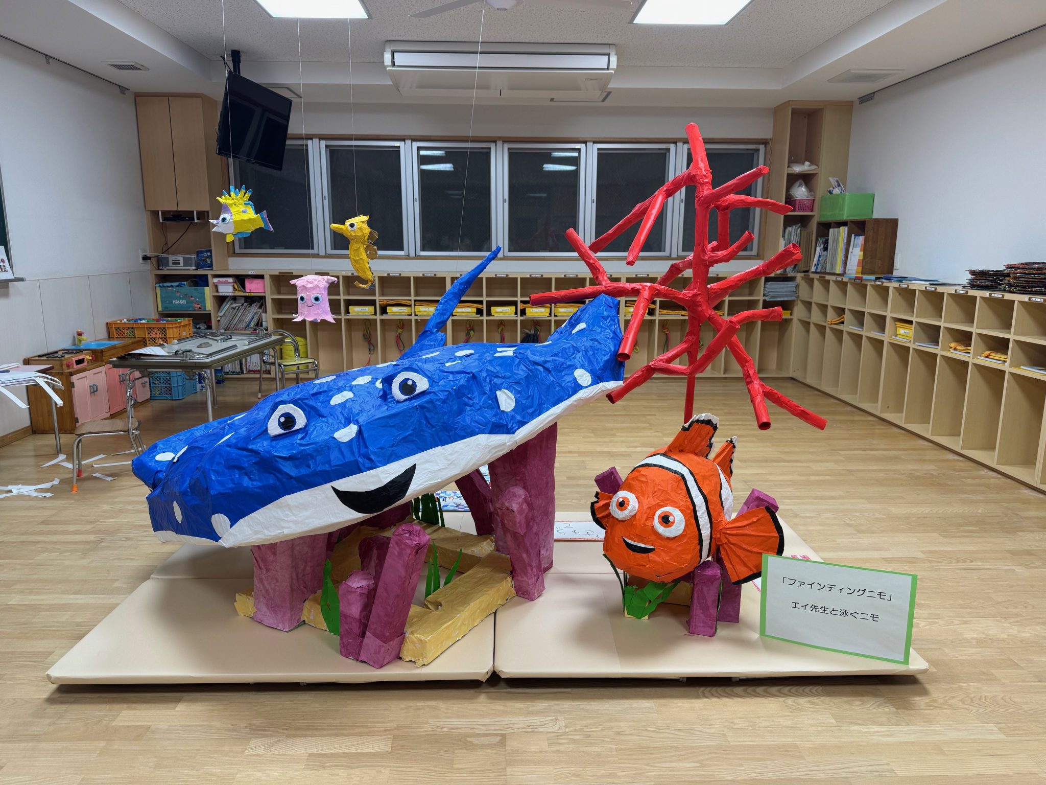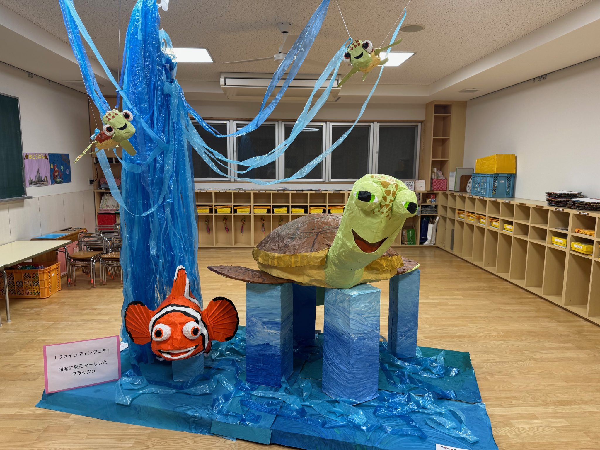 また、年少組はみんなが大好きな「アンパンマン」年中組は「ファインティングニモ」をテーマに各クラスで共同製作を作りました。
