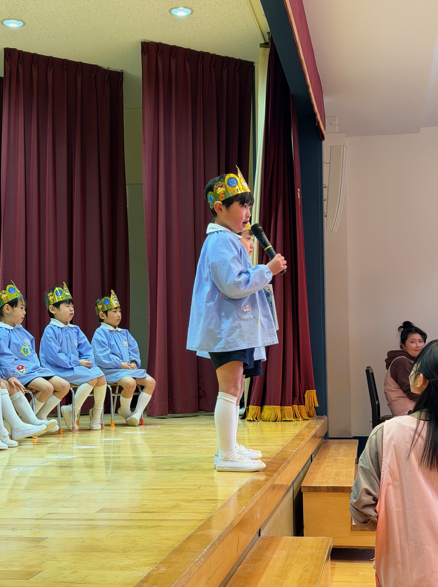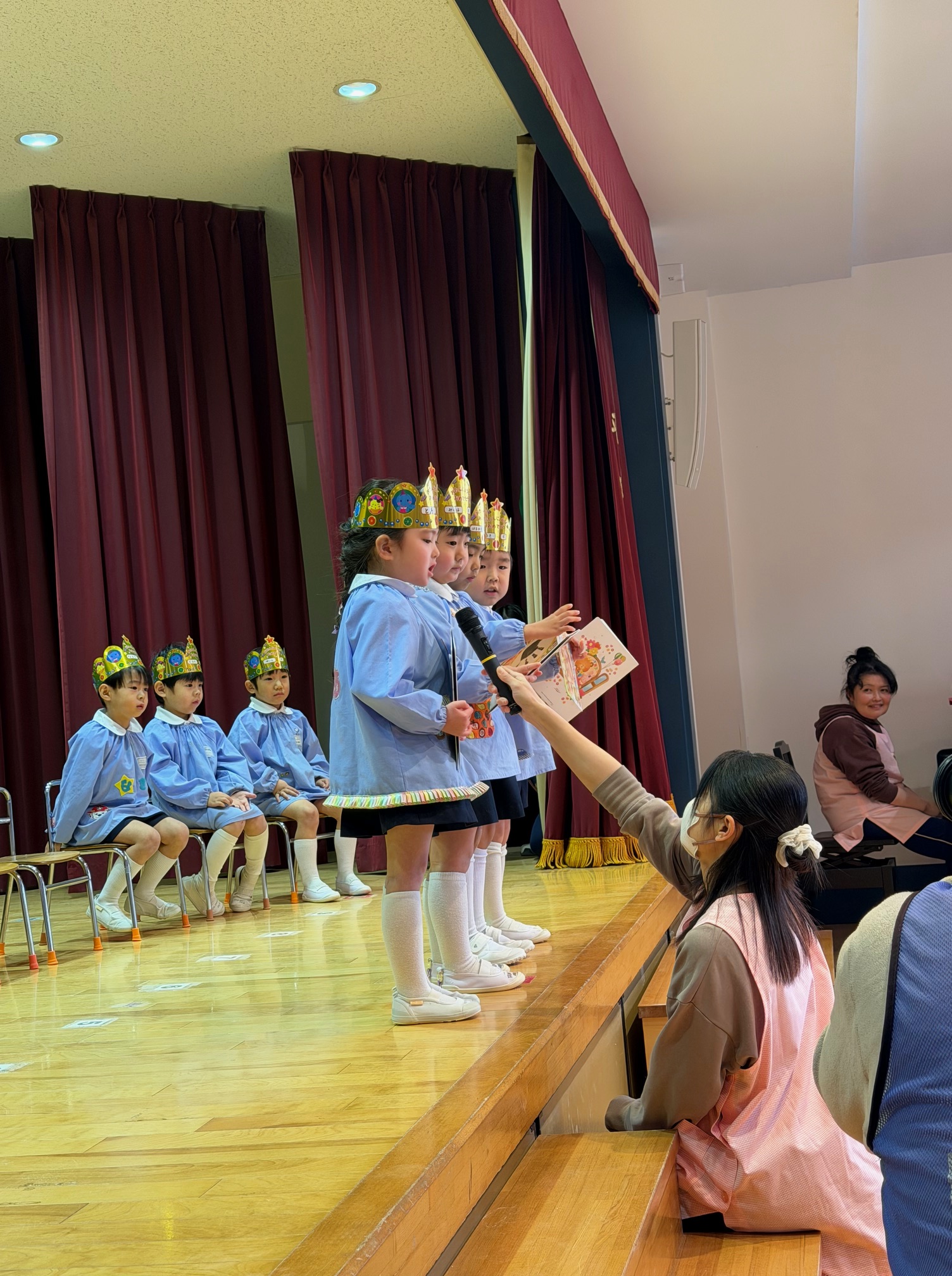 待ちに待った誕生会。誕生児のお友だちは少し緊張した様子も見られましたが、インタビューでは一人ひとりがしっかりと受け答えをすることができました。